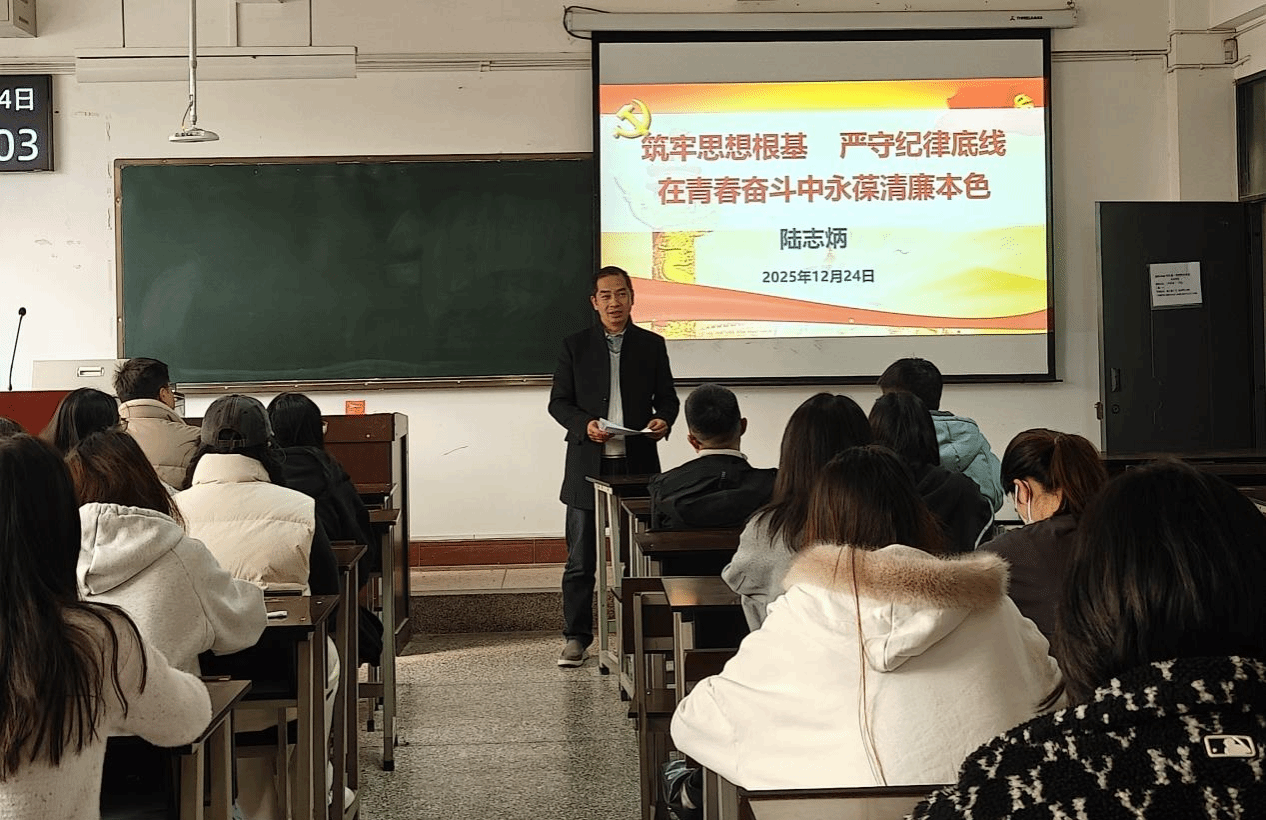 2025年12月24日下午,为推进全面从严治党向基层延伸,加强学生党员党风廉政教育,学院党委陆志炳副书记在逸夫楼C203,为学生一支部全体党员及积极分子讲授《筑牢思想根基 严守纪律底线 在青春奋斗中永葆清廉本色》专题廉政党课。