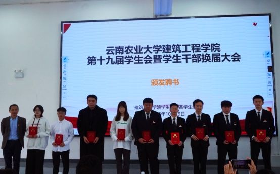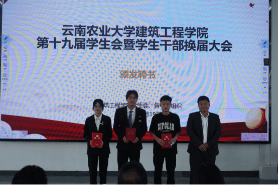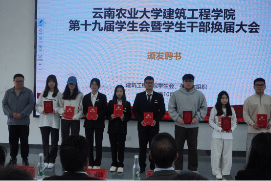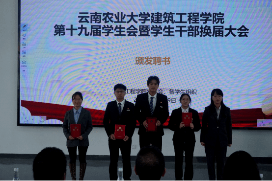 在庄严的国歌声中,本次换届大会正式拉开帷幕。学院团委书记朱诗芳老师宣读了建筑工程学院第十九届学生会、第二届院长助理、第二届艺术团、第三届就业与创新创业协会及各运动队的学生干部任职名单。在场领导和老师为新一届学生干部颁发了聘书。一份份聘书,既是荣誉的象征,更是责任的嘱托,在闪光灯的定格中,新老接力的使命感在会场中久久回荡。