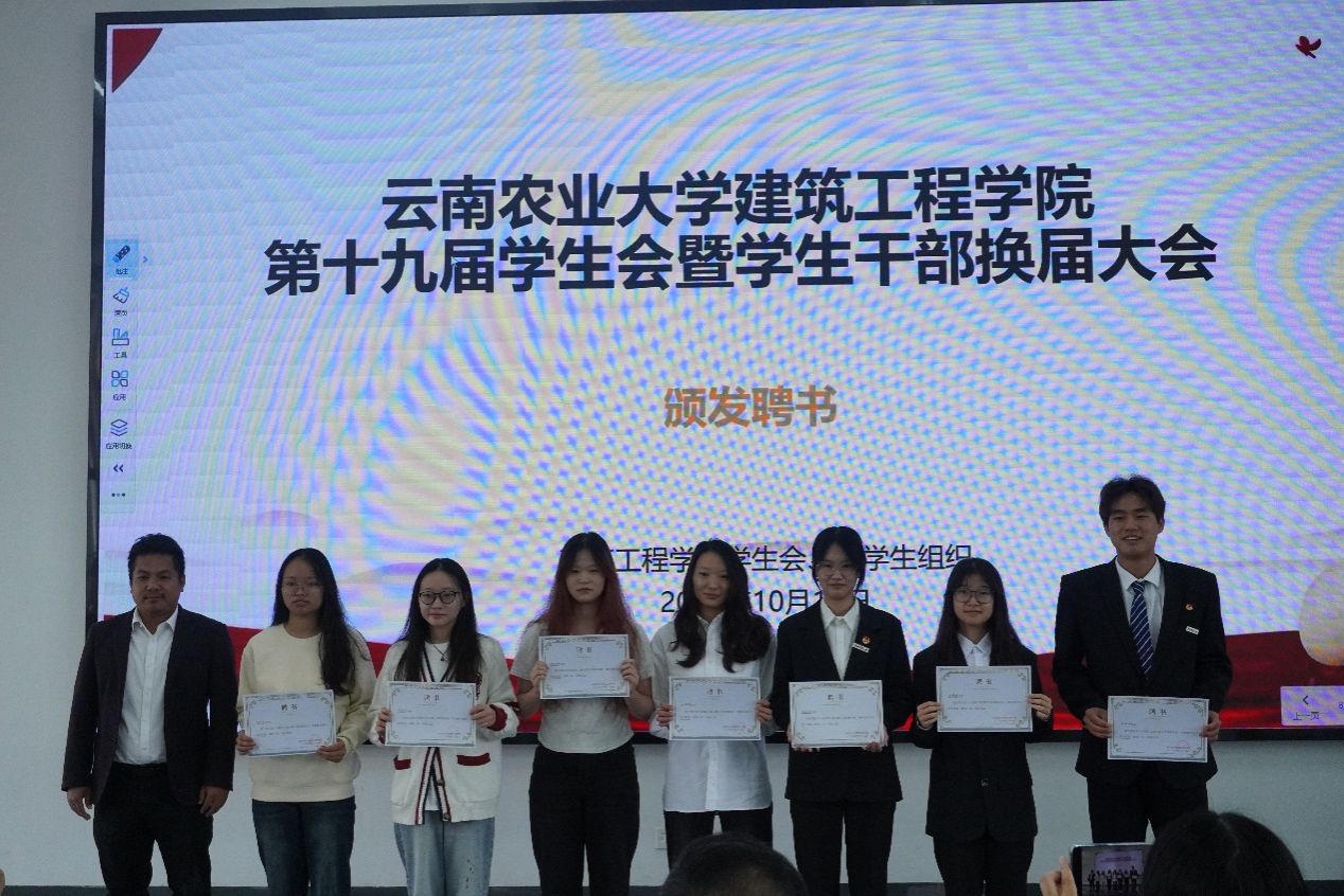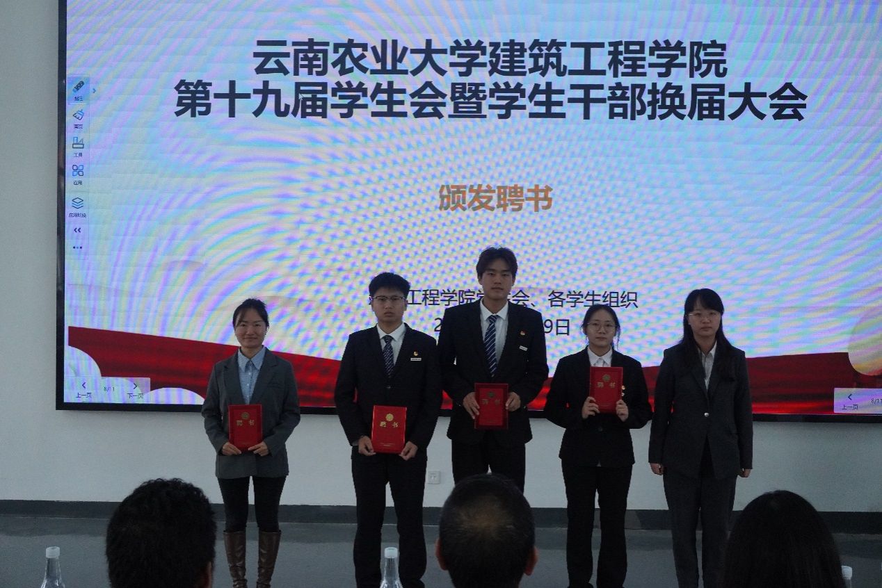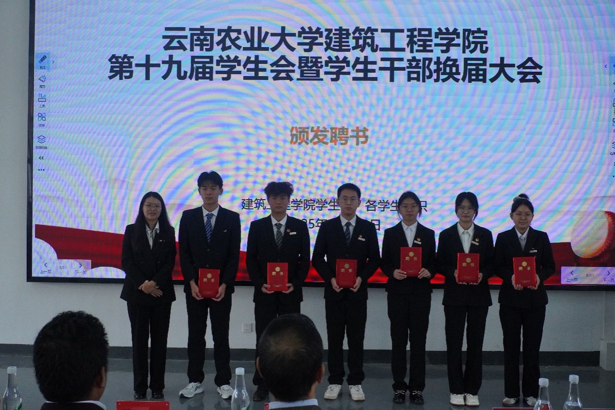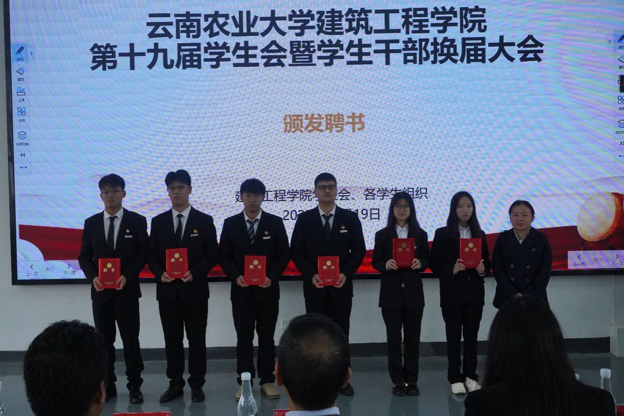 在庄严的国歌声中,本次换届大会正式拉开帷幕。学院团委书记朱诗芳老师宣读了建筑工程学院第十九届学生会、第二届院长助理、第二届艺术团、第三届就业与创新创业协会及各运动队的学生干部任职名单。在场领导和老师为新一届学生干部颁发了聘书。一份份聘书,既是荣誉的象征,更是责任的嘱托,在闪光灯的定格中,新老接力的使命感在会场中久久回荡。